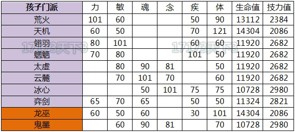 以下为天下3各门派孩子80级时的固定属性数值(无技能、装备、潜能点加成的数值)