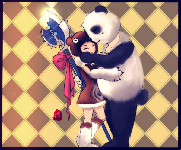 某日和媳妇还有师弟一起做周常~~聊天中说起师弟的画,于是媳妇也想要一张,这样就有了下面的图~~~当时媳妇穿的小熊装,某狐穿的熊猫装,在一起倒也和谐~~