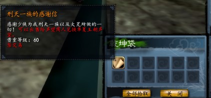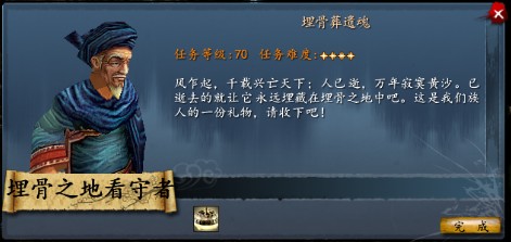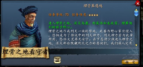 在副本门口有一个金色问号,也就是埋骨葬遗魂,此任务是需要在埋骨之地中杀掉3个BOSS,完成任务后会获得一个丹萍之礼,打开宝盒会随机获得物品,人品好的话会获得60套下摆,此次更新实测中,我们队伍中一个人品爆发了,获得了一个震旦摆····坑爹啊,而其他的朋友只获得了一封,刑天一族的感谢信!