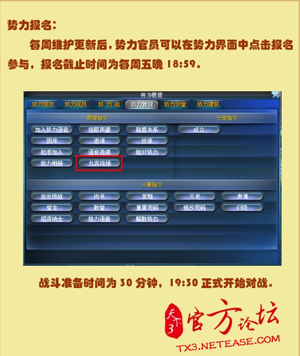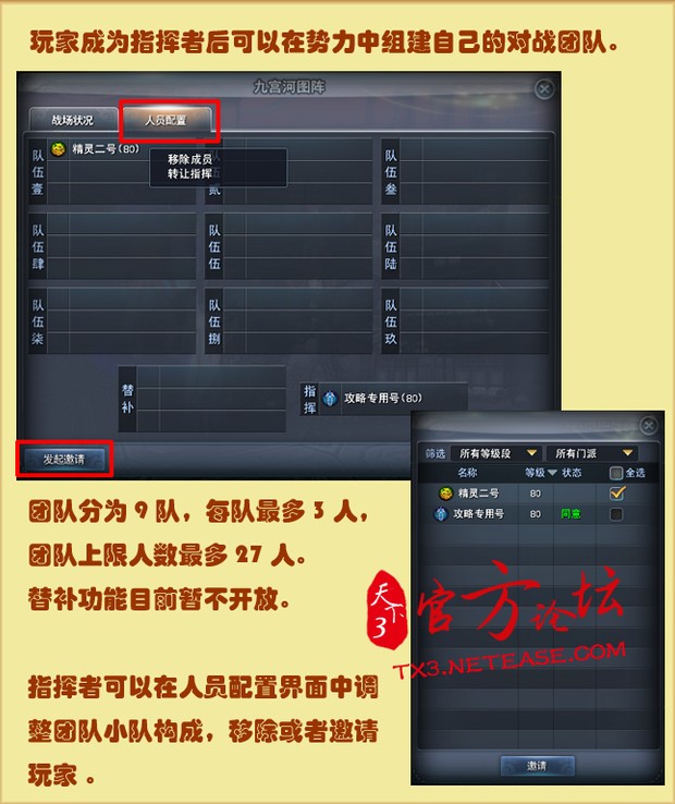 对战准备阶段,系统会向申请报名过的势力发出通知,按势力主、势力官员以及势力成员的顺序邀请成为九宫河图阵对抗的团队指挥者。