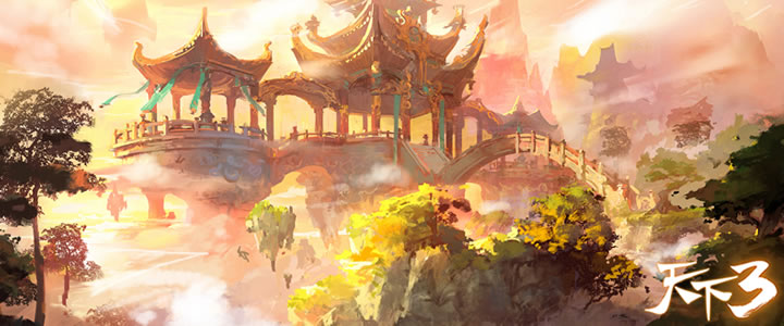 极目远眺,只见远处数座亭台在山峦环绕之间而起。淡绿飘带系在亭台檐角,随风而起,飘逸而温柔,如同仙女翩然起舞的水袖。仔细凝视图中幻境,耳边似乎有袅袅仙乐自亭中传来。